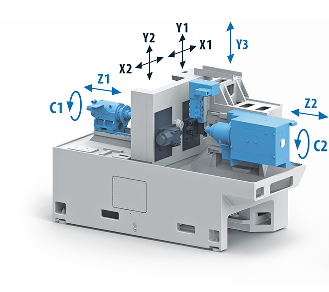 La macchina è equipaggiata di serie con due mandrini elettrici con velocità massima di 10.000 giri / min e una bussola di guida rotante sincronizzata con il mandrino principale tramite pulegge e cinghie. Sette assi lineari CNC (X1, X2, Y1, Y2, Y3, Z1, Z2), due assi rotanti (C1, C2) consentono di lavorare parti sia semplici che complesse con un’elevata produttività. Il design consente di utilizzare contemporaneamente fino a 3 utensili in un taglio. Motore mandrino primario molto potente!!! La macchina è molto potente nella fresatura, l'utensile lavora con coppia fino a 32 Nm.
