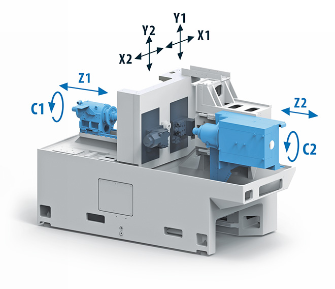 La macchina è equipaggiata di serie con due mandrini elettrici con velocità massima di 10.000 giri / min e una bussola di guida rotante sincronizzata con il mandrino principale tramite pulegge e cinghie. Sei assi CNC lineari (X1, X2, Y1, Y2, Z1, Z2), due assi rotanti (C1, C2). Il grande vantaggio di questo modello è la possibilità di eseguire una tornitura o una fresatura parallela con due utensili contemporaneamente. La macchina è molto potente nella fresatura, l'utensile lavora con coppia fino a 32 Nm.