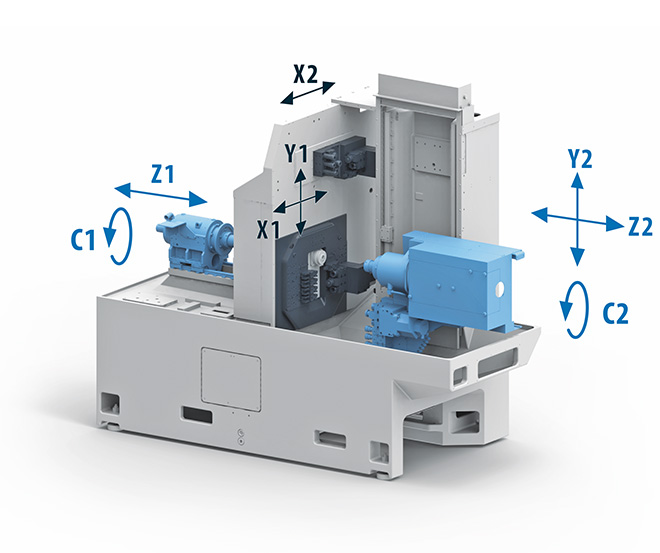 La macchina è equipaggiata di serie con due mandrini elettrici con velocità massima di 10.000 giri / min e una bussola di guida rotante sincronizzata con il mandrino principale tramite pulegge e cinghie. Sei assi CNC lineari (X1, X2, Y1, Y2, Z1, Z2), due assi rotanti (C1, C2). La macchina è molto potente nella fresatura, l'utensile lavora con coppia fino a 32 Nm.
