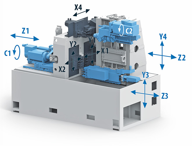 Le caratteristiche principali di K'MX SWING sono: produttività fino a 23 utensili, di cui 14 motorizzati. 10 assi lineari CNC (X1, X2, X4, Y1, Y2, Y3, Y4, Z1, Z2, Z3) e due assi rotanti (C1, C2) consentono l'uso di 4 utensili contemporaneamente. Cambio utensile semplice e rapido con un sistema di portautensili compatibile. Programmazione semplificata grazie al software K'MX PLUS in esecuzione su MS Windows. Accesso ergonomico e semplificato con grande apertura della porta.